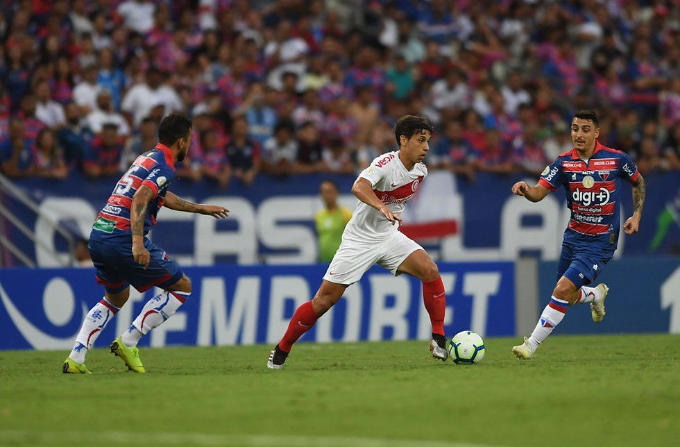 33min - Zeca recebe boa bola de Rithely e bota na área. A zaga afasta e, quando o Fortaleza tentava armar o contra-ataque, o lateral direito colorado apareceu para recuperar.